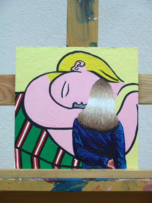 Dit werk van 20 x 20 cm toont een vrouw genietend van een schilderij van Picasso.