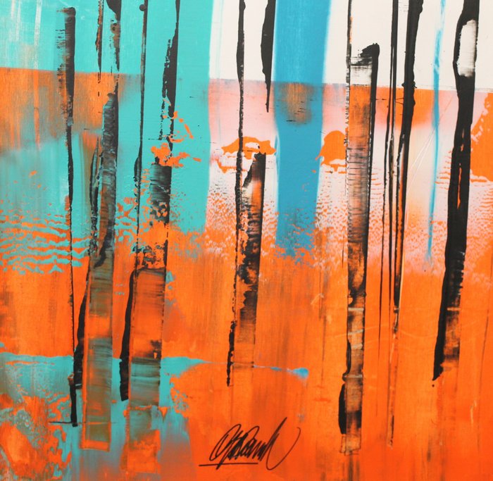 Zelfs de zijkanten van het werk lijken geschilderd, slechts enkele centimeters per kant zijn wit gelaten. Eenmaal gemonteerd op het frame is de nettomaat ongeveer 100X70 cm.