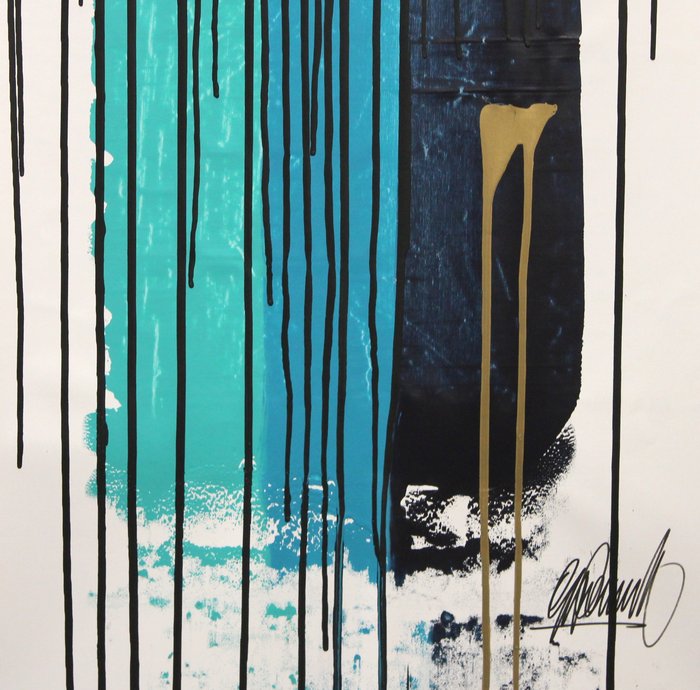 Zelfs de zijkanten van het werk lijken geschilderd, slechts enkele centimeters per kant zijn wit gelaten. Eenmaal gemonteerd op het frame is de nettomaat ongeveer 100X70 cm.