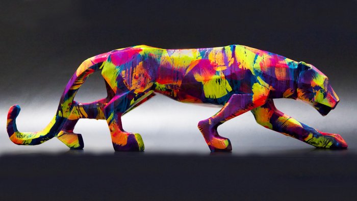 Bochtige panter gemaakt met duidelijke randen, een zwarte basis wordt onderbroken door druppels en blauwe druppels met gele en magenta strepen die, wanneer ze eroverheen worden gelegd, nieuwe fuchsia-tinten creëren.