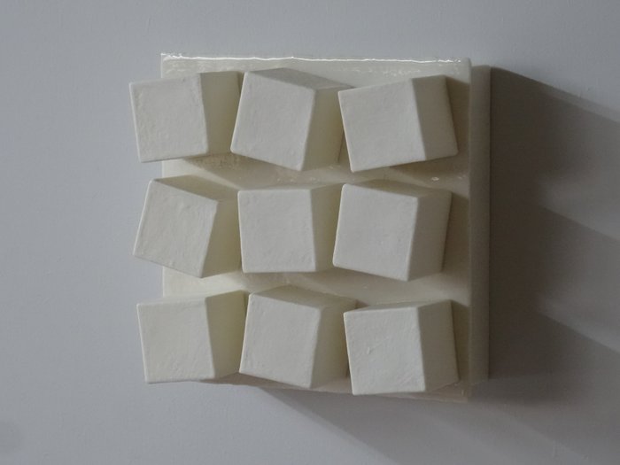 During the most recent years he has further developped his ceramic skills and works with creamy white wafer-thin slices of porcelain that are mounted into cubes or pyramids. By stacking these geometric shapes in repetitive patterns he creates sculptures that are reminiscent of the Dutch Zero-movement and in particular the works by Jan Schoonhoven, but in the end clearly bears the artists’ own signature. He applies his decades-long experience to create a dialogue between inner and outer space, between geometric and organic, between order and chaos.