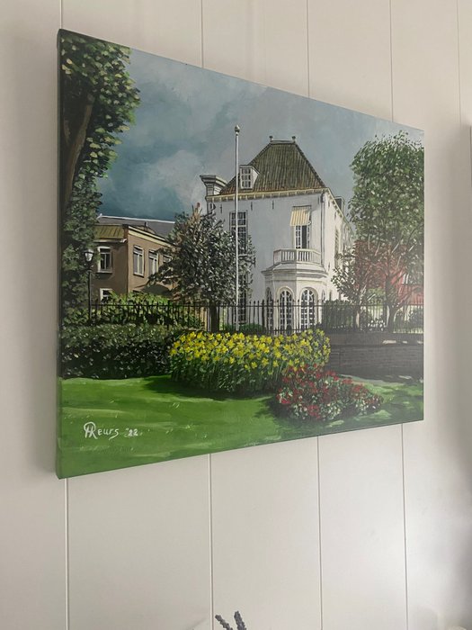 Een canvasdoek geschilderd met acrylverf, geproduceerd in 2022, afgewerkt met vernis en voorzien van ophangbeugel , dit doek is een eigen werk , de titel is “ het witte huis”