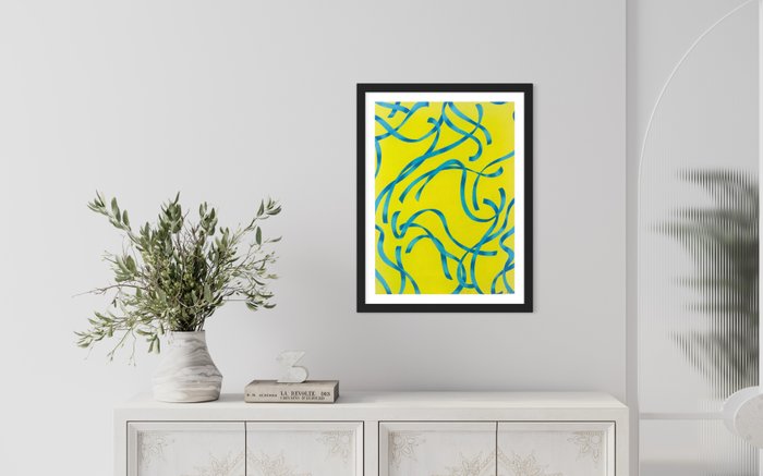 Het kunstwerk is gemaakt met acryl op papier en vervolgens op karton gefixeerd. Het is een werk van grote finesse en een demonstratie van techniek van de kunstenaar. We kunnen enkele patronen waarnemen die zijn gemaakt met een lasersnijder.