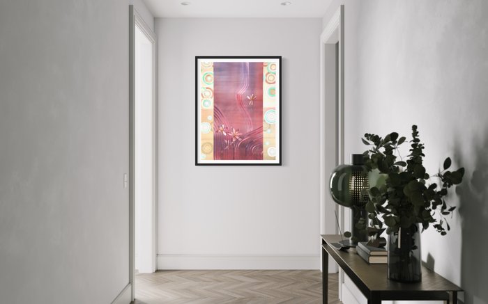 Het kunstwerk is gemaakt met acryl op papier en vervolgens op karton gefixeerd. Het is een werk van grote finesse en een demonstratie van techniek van de kunstenaar.