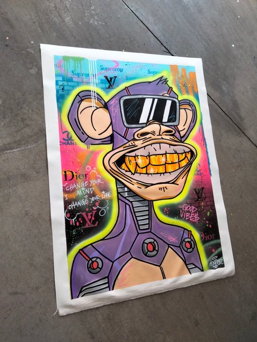 Handbeschilderd met spuitverf en acryl (UV) op doekmaat 110x80cm, schilderijmaat is 100x70cm, 5cm witte rand is rond het doek gelaten om in te lijsten, 100% katoen zuurvrij een medium korrel, drievoudige gipspriming, glanzende beschermende eindvernis.