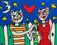 Een fantastische typische Rizzi print uit 1995. Jimmy was gek op katten en ook de beroemde RIZZI vogels vind je hier terug. Geweldige kleuren.