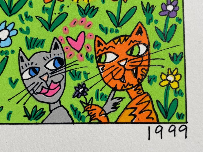 Een fantastische Rizzi-print uit 1999. Twee VW-kevers die verliefd werden, een liefdespaar, twee verliefde katten, verliefde Rizzi-vogels, alles verliefd. Geweldige kleuren.