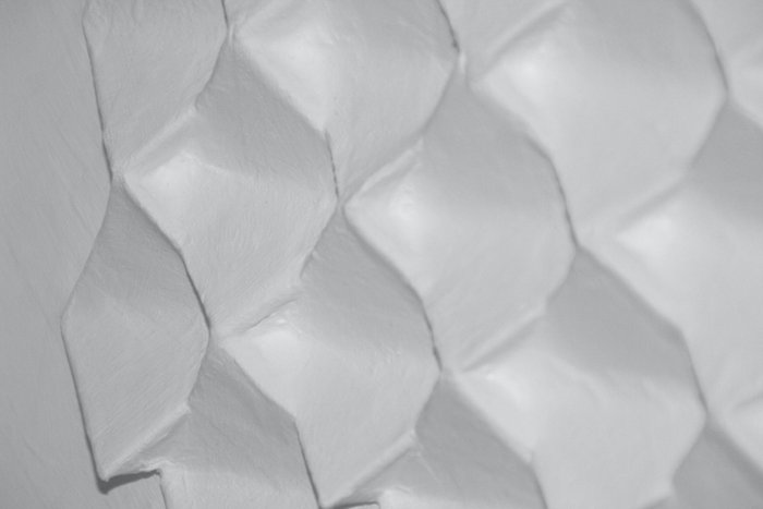 geometrisch-abstract relief, herinnert aan De Stijl en Zero, spiritueel en meditatief, zorgvuldig gecomponeerd en geconstrueerd uit karton en papieren elementen, vangt het licht vanuit verschillende standpunten en gedurende verschillende momenten van de dag.