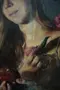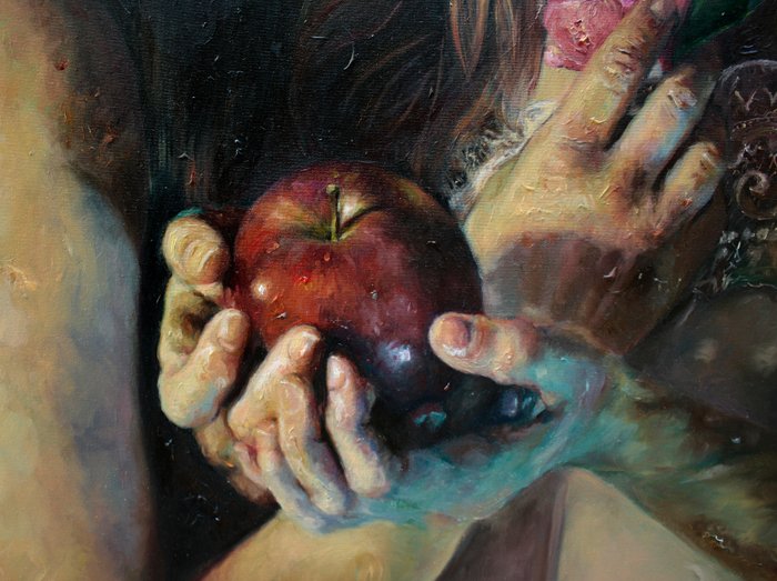 Olieverfschilderij op canvas, verfijnd in het opstellen van kleuren en levendige penseelstreken en met technische perfectie. Zelfde titel als een gedicht van Sappho, de twee vrouwen voeren bijna een ritueel uit met krachtige gebaren. Het houden van de appel symboliseert kostbaarheid en een sterk verlangen.