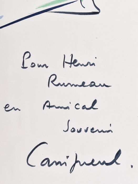 Een mooie tekening van de beroemde kunstenaar Jean-Pierre Cassigneul. Een klein boeketje bloemen. Het werk was een cadeau voor zijn rugbyvriend Rommeau.