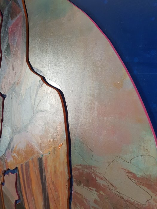 -Werk gemaakt in meerdere lagen 5 en 10 mm DM hout. Compositie die geometrische abstractie wil combineren met figuratie. Het werk heeft geen rechthoekig formaat.