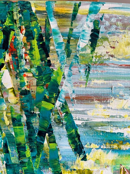 Ik gebruik graag een helder palet met sterke, vrolijke kleuren, met een subtiel spel tussen opaciteit/transparantie, figuratief en abstract.