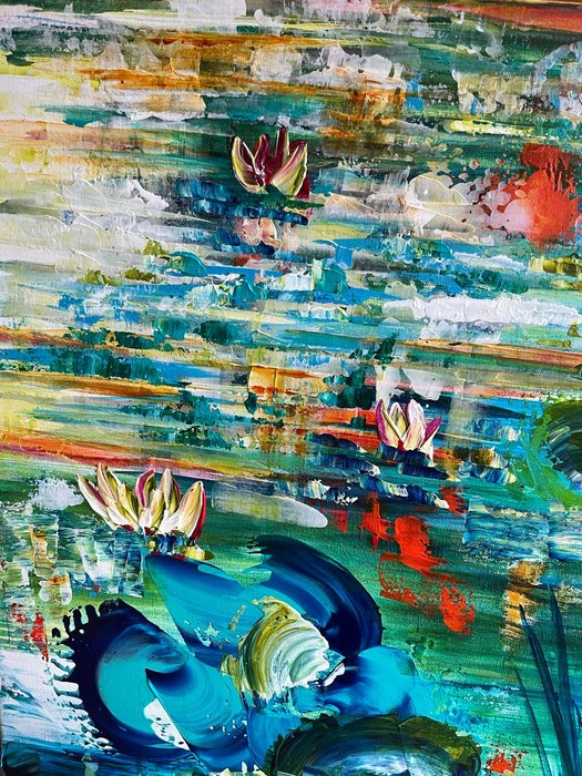 Ik gebruik graag een helder palet met sterke, vrolijke kleuren, met een subtiel spel tussen opaciteit/transparantie, figuratief en abstract.
