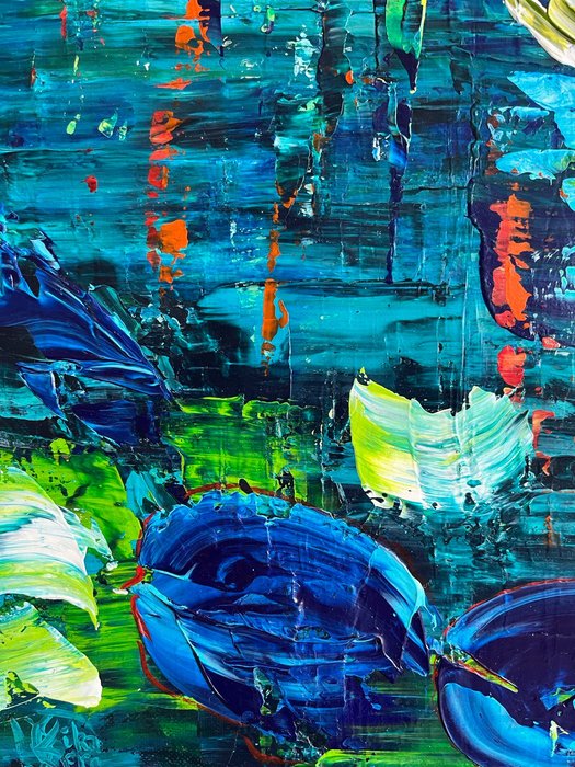 Ik gebruik graag een helder palet met sterke, vrolijke kleuren, met een subtiel spel tussen opaciteit/transparantie, figuratief en abstract.