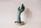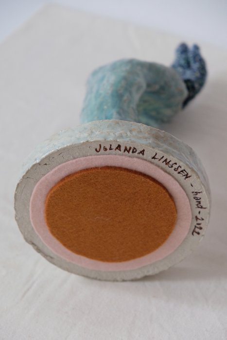 'Hand' is gemaakt van keramiek met Amaco-glazuur en een handschoen met borduursel. Het warme en koude contrast in het materiaal is erg interessant om mee te werken. De aandacht die in het maakproces is gestoken is een extra laag in dit beeld. Twee verschillende ambachten die elkaars uitstraling verrijken.