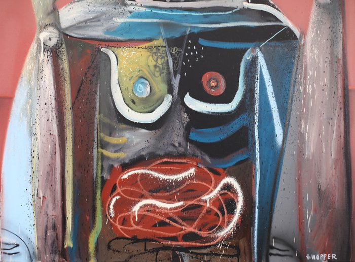 - Gemengde techniek: spuitverf, pastel en acryl op canvas