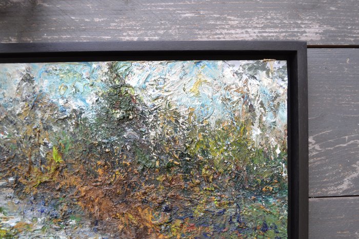 Typerend werk van kunstenaar Jos Boetzkes. Techniek is olieverf op aluminium. Voorzien van zwarte baklijst (deze heeft lichte gebruikssporen).