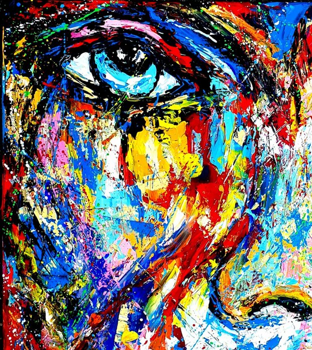 Origineel abstract expressionistisch painting uit, ''Abstract face serie'' van Nederlandse professionele contemporary artist Jovan Srijemac(1962). Werk is geschilderd met palletmes met acryl verf op canvas . Verf is spontan, expressief en met veel dynamiek op doek aangebracht. Gevernist, en met certificaat van echtheid
