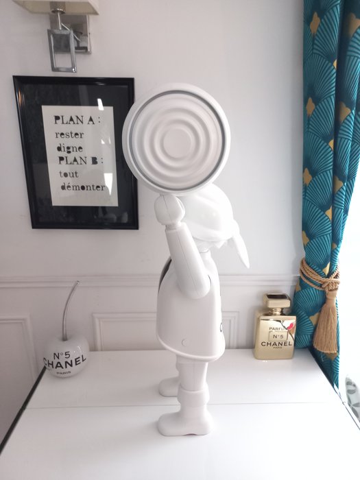 Hij herbekijkt het werk op zijn eigen manier door een prachtige glanzend witte Playmobil Chanel Noir aan te bieden met een echt metalen vat in dezelfde kleuren.