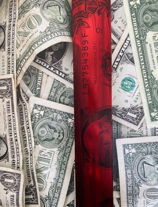 Authentiek rood verguldsel versterkt met een origineel bankbiljet van $ 1 in collage