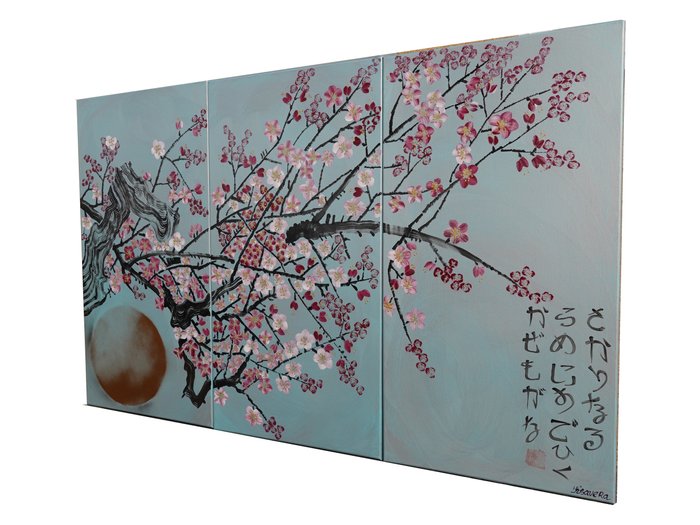 Japanse sakura J270 - groot zilver turquoise drieluik, originele kunst, schilderijen in Japanse stijl
