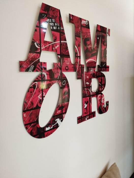Amor art van Lascaz is een kunstwerk gemaakt in gemengde techniek op aluminium, en gelakt voor een hoge intensiteit kleurweergave, een glanseffect en een duurzame bescherming van de creatie.