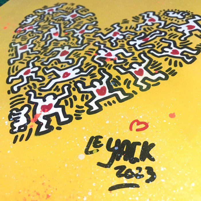 Rechtstreeks uit de werkplaats. Geel en rood beeldhouwwerk. Uniek stuk, elk stuk is anders, verschillende kleuren en tekening op de voorkant van het gepersonaliseerde karakter. Mix "The Heart Bearers" van Keith Haring en "The Flower Thrower" van Banksy. Werk bestaande uit een beeld van 20 cm hoog, een schilderij van 24 cm. Plus lijst 37x37 cm. Het werk kan worden opgehangen of op een meubel worden geplaatst. Le Yack, opkomende Franse pop- en straatartiest. Alexandre Pelletier, bekend als Le Yack, werd geboren in 1972 in Tours. Tijdens zijn studies ging hij naar de School of Art and Design (ESAD) in Orléans. Hij is artistiek directeur in uitgeverijen en het web. In 2020 begint de kunstenaar Le Yack aan een 'graffiti'-schilderij, in een poging een universum te creëren door mythische personages uit onze moderne samenleving op te nemen, zoals Frida Kahlo, Uma Thurman die een eerbetoon brengt aan stedelijke kunst. Eerste tentoonstelling Galerie Empreinte d'Orléans 2022.