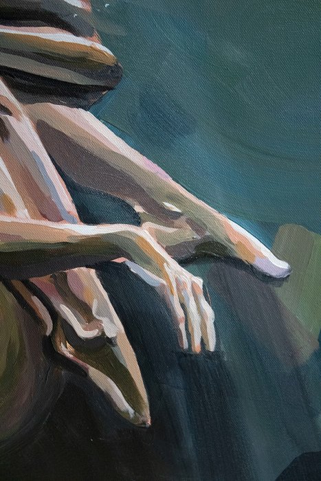 In dit kunstwerk is de droomwereld onder water het onderwerp. Ook hier heb ik, net als in veel van mijn andere werken, een persoon in het water afgebeeld die in de diepte een weg naar zichzelf zoekt. Ook hier speelt gewichtloosheid een grote rol.