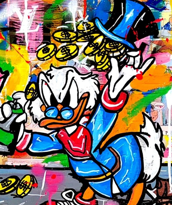 Handgeschilderd op stripcollage aangebracht op canvas, met hoogwaardige acrylverf en spuitbussen.