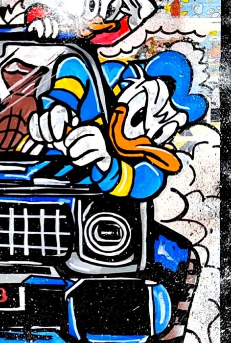 Handgeschilderd op stripcollage aangebracht op canvas, met hoogwaardige acrylverf en spuitbussen.