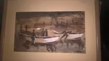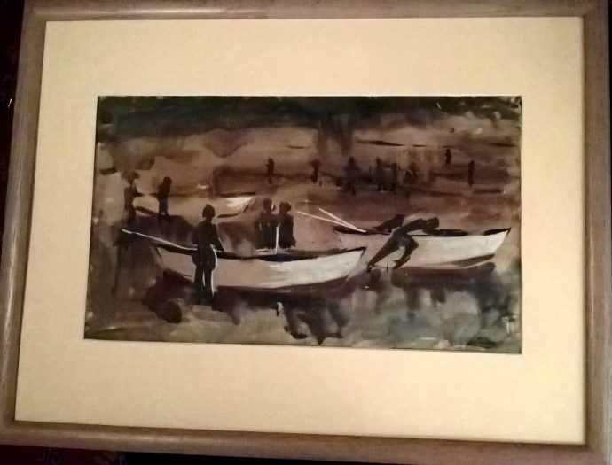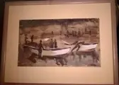 Luis Lobo Parga 1920-1992 Chili aquarel / inkt '' Vissersboten aan het werk " 27 x46 cm.