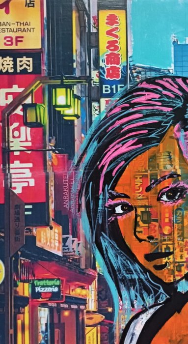 SAYONARA BABY. Acryl, collage en acrylstift op vellen papier gelijmd op gaas 40 x 40 cm. Handgesigneerd en gecertificeerd.
