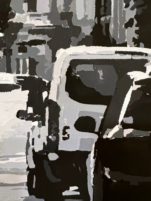SoHo, een modieuze wijk in Manhattan tussen Greenwich Village, Little Italy, Tribeca en Chinatown, staat bekend om zijn levendige sfeer, gietijzeren gebouwen, kunstgalerijen en musea. De naam "SoHo" is een afkorting voor "ten zuiden van Houston." Temidden van de ingewikkelde patronen van zwarte en witte lijnen, dragen de brandtraptrappen en hangende verkeerslichten bij aan het iconische karakter van de buurt. Dit schilderij is echter rijk aan verborgen details die ontdekt kunnen worden te midden van het samenspel van donkere en lichte tinten en reflecties.