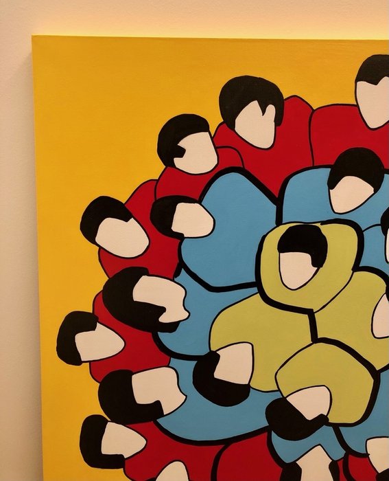 Acryl en email op doek 100 x 100 x 3,5 cm, signatuur linksonder, echtheidsverklaring door de kunstenaar op foto en certificaat van garantie en echtheid van het veilinghuis, werk zonder lijst.