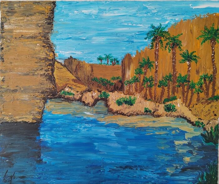 OASIS Ghoufi. Schilderij op acryl canvas, geschilderd met een mes. Uitstekende staat.