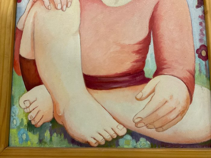 Aangeboden: modern schilderij van een zittende vrouw met een vogel en bloemen.