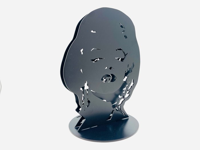Techniek: Sculptuur gemaakt met 4 mm dikke aluminium plaat met poedercoating verf. Acrylverf, maskers, stiften, spuitverf.