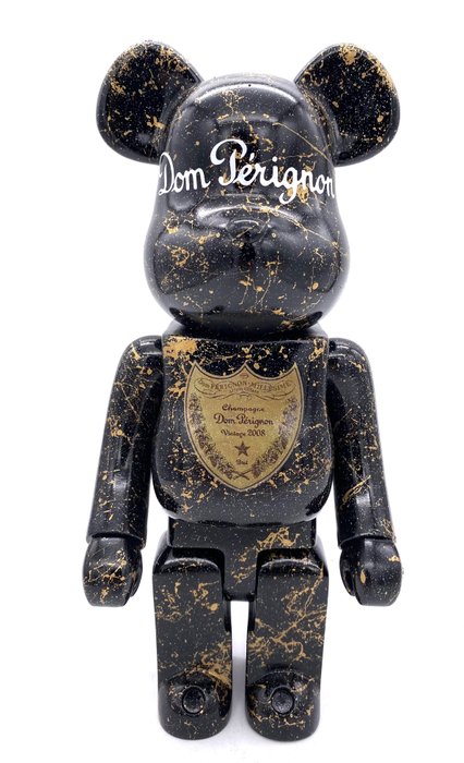 Handgeschilderde BearBrick, embleem op de borst en dom perignon schrijven op ooghoogte. Laatste glitterafwerking.