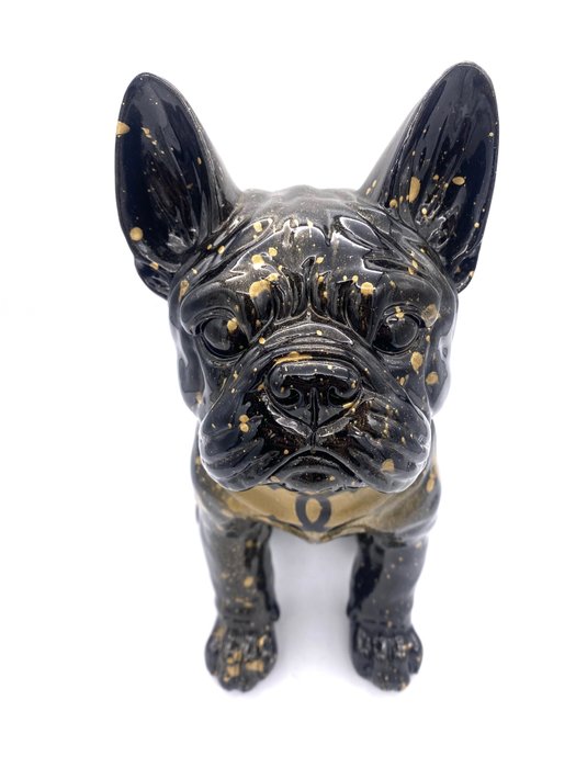 29 cm hoog beeld van een zwart en goud geschilderde buldog, Chanel thema. Volledig geschilderd, geen applicaties, geen stickers.