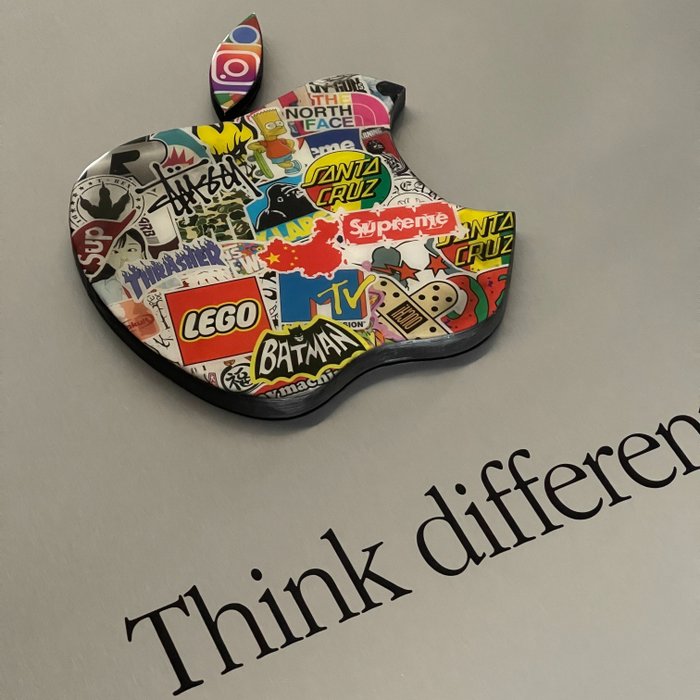 Dit werk is gemaakt met houtsnijwerk en stickers, geharsen en geïnstalleerd op een plaat van geborsteld aluminium met laserprint.
