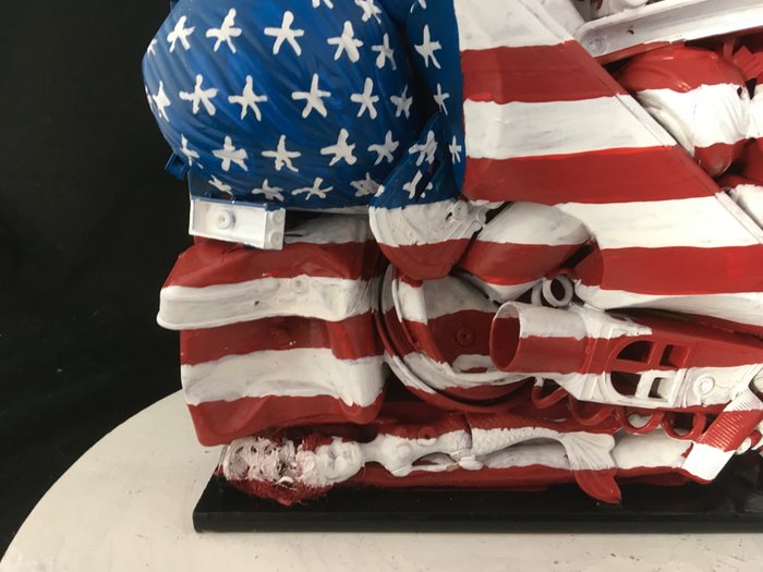 Medium: gerecyclede voorwerpen, spuitbus en acryl op zwarte sokkel.