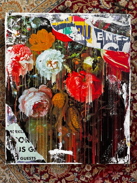 De straatkunstenaar geeft leven aan creaties op verschillende media, van prints tot canvassen tot fotografie, alles wordt aangevallen door de meerdere lagen collage en verf.