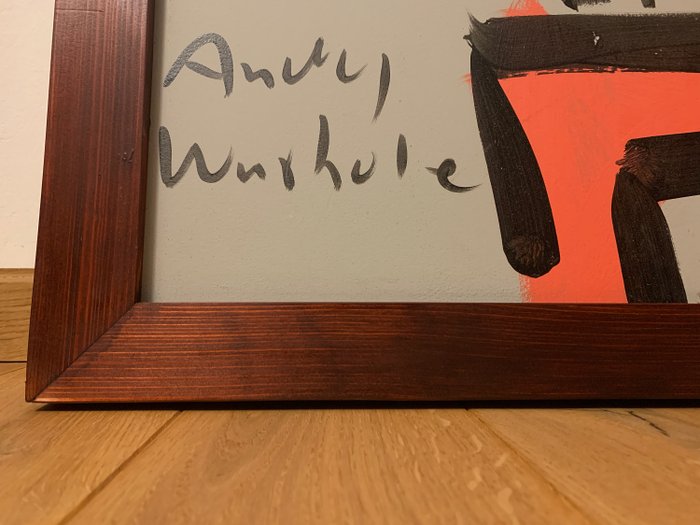 Groot formaat werk "Andy Warhol" van Peter Robert Keil (geboren 1942 in Züllichau/Pommeren). Acryl op dik karton, gesigneerd "Andy Warhol" linksonder en gesigneerd linksboven: P. Keil. Gefixeerd op hardboard en ingelijst in een stevige bruinkleurige echt houten lijst, afmetingen van het werk (zonder lijst): hoogte ca. 100 cm, breedte ca. 100 cm. Afmetingen met lijst: hoogte ca. 110 cm, breedte ca. 110 cm, diepte ca. 4 cm.