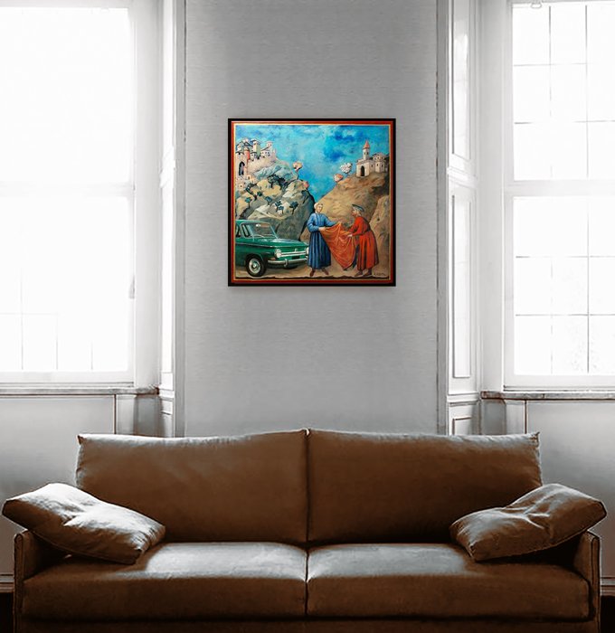 Hulde aan Giotto. De afbeelding is aan de randen afgewerkt met een gouden draad, klaar om op te hangen. Op het schilderij zelf wordt een laatste halfglanzende beschermende vernis aangebracht. De verpakking wordt met de grootste zorg gemaakt en de verzending gebeurt per koerier met constante tracking. Certificaat van echtheid en directe herkomst uit het atelier van de kunstenaar.