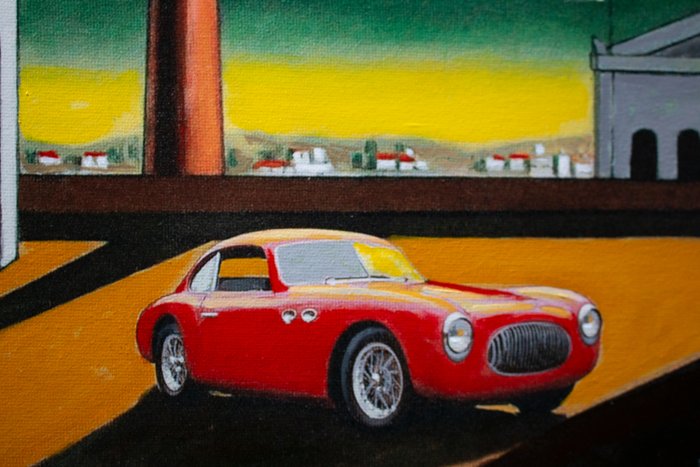 Hulde aan De Chirico en de nostalgische Cisitalia van weleer. Op het schilderij zelf wordt een laatste halfglanzende beschermende vernis aangebracht. Klaar om op te hangen. De verpakking wordt met de grootste zorg gemaakt en de verzending gebeurt per koerier met constante tracking. Certificaat van echtheid en directe herkomst uit het atelier van de kunstenaar.