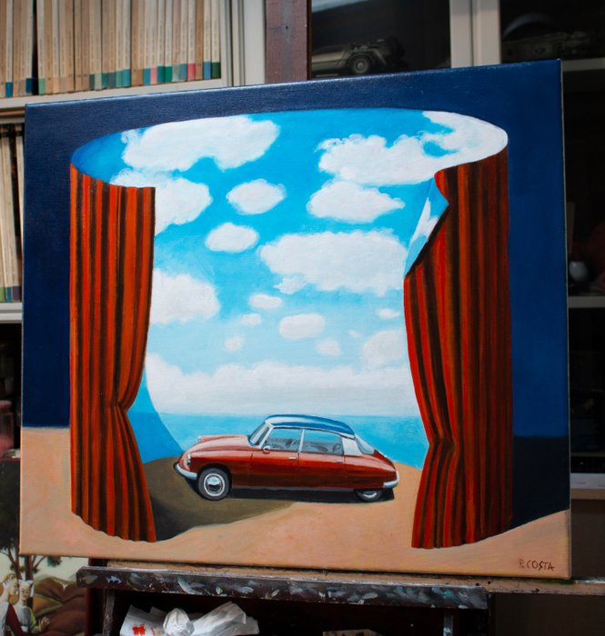 De legendarische DS 19 toont zich op een surrealistisch Magriteaans podium. Op het schilderij zelf wordt een laatste halfglanzende beschermende vernis aangebracht. De verpakking wordt met de grootste zorg gemaakt en de verzending gebeurt per koerier met constante tracking. Certificaat van echtheid en directe herkomst uit het atelier van de kunstenaar.