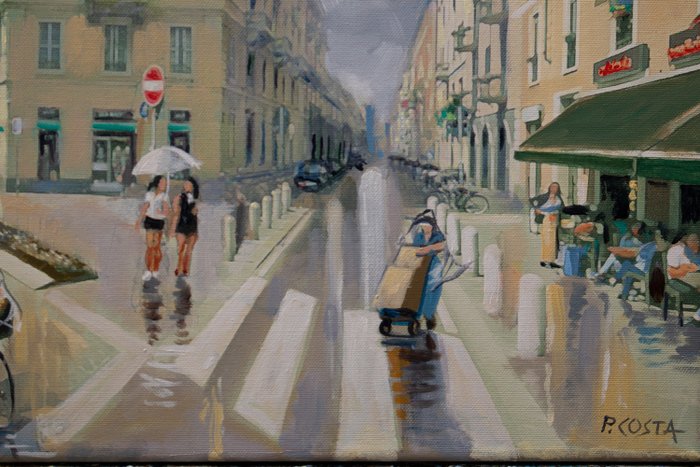 Mooie glimp van de Milanese Chinatown op een druilerige dag. Op het schilderij zelf wordt een laatste halfglanzende beschermende vernis aangebracht. De verpakking wordt met de grootste zorg gemaakt en de verzending gebeurt per koerier met constante tracking. Certificaat van echtheid en directe herkomst uit het atelier van de kunstenaar.