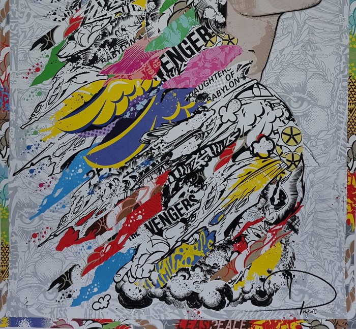 Dit voorbeeld meet 76cm x 55cm. Het is een uniek 1/1 kunstwerk dat gesigneerd, genummerd (1/1) en blind gestempeld is door de kunstenaar en vergezeld gaat van een COA.