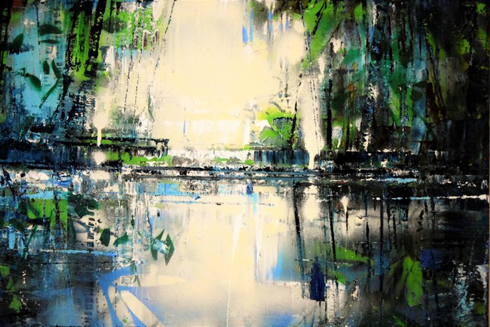 Het semi-abstracte landschap is geschilderd in hoogwaardig acrylaat op 70% katoen, 30% in polyester, dicht kwaliteitsdoek van 370 mg/m², geschikt voor een frame van 80 X 120cm, gesigneerd op de achterkant; het doek wordt ongemonteerd en zonder brancards verzonden, opgerold in een kartonnen koker, met certificaat van echtheid.