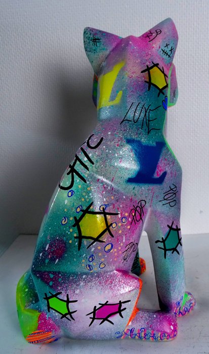 Harssculptuur geschilderd met gemengde technieken (aerosol, markers, stencils) en vervolgens bedekt met een ultraglanzende dubbellaagse vernis, anti-UV-beschermer.